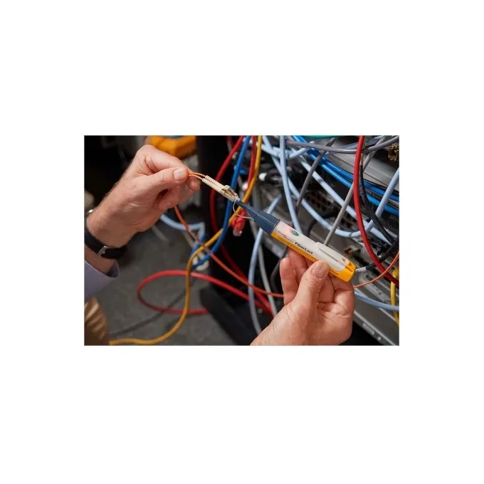 O FiberLert é um detector de fibra viva que detecta a luz infravermelha emitida por cabos de fibra óptica. Um brilho vermelho contínuo na alça e um ruído sonoro audível ( se não for desligado ) indica a presença de luz infravermelha próxima. |