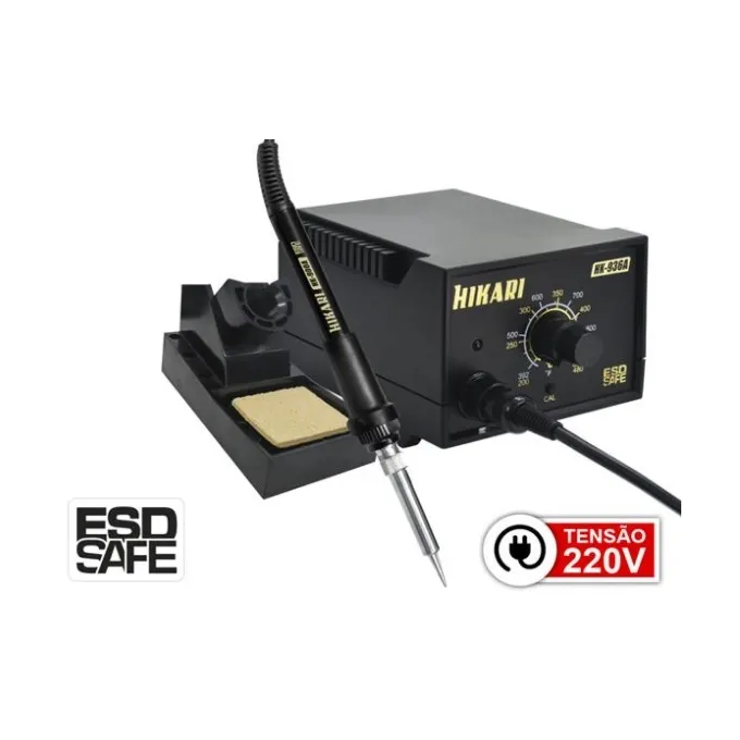 A Estação de Solda Modelo HK-936A se destaca por facilitar a soldagem de componentes PTH e SMD, pela rápida recuperação térmica e pela faixa de temperatura ajustável. Material em ESD, estação e ferro aterrados proporciona maior segurança e proteção.