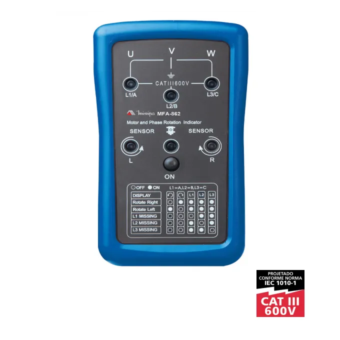 O fasímetro MFA-862 é um instrumento operacional portátil amplamente aplicável para examinar a direção das fases de um sistema trifásico industrial, assim como a detecção do sentido de rotação do motor.