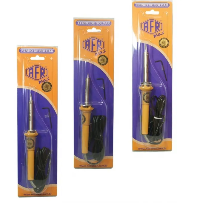 Os Ferros de Soldar AFR MAX são 100% montados e testados no Brasil. Foram projetados para as mais variadas aplicações na indústria eletrônica, escolas técnicas, faculdades e até mesmo hobbistas. São ferros customizados de altíssimo desempenho. • Cabo de Nylon e tubo de aço inoxidável. • Rabicho com normas do INMETRO. • Resistência e Pontas intercambiáveis. • Pontas Metalizadas cônica ou fenda. • Opção para terceiro fio de aterramento.