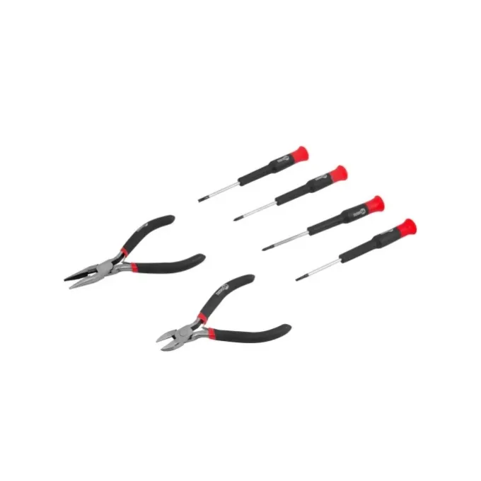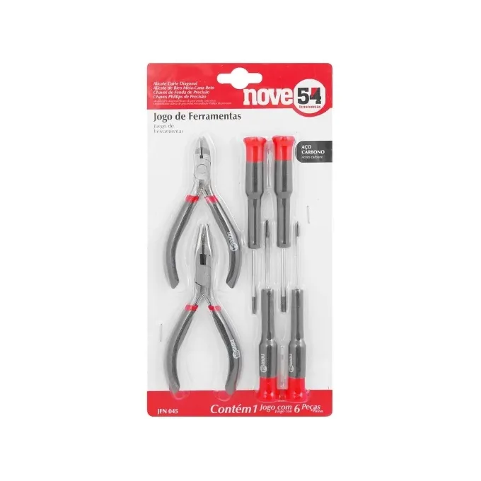 Conteúdo da embalagem: 1 Jogo de ferramentas, composto por 6 peças, sendo: 1 alicate corte diagonal 4.1/2", 1 alicate bico meia cana reto de 4.1/2", 2 chaves de fenda de precisão (2,5 mm e 3,0 mm) e 2 chaves phillips de precisão (2,5 mm e 3,0 mm).