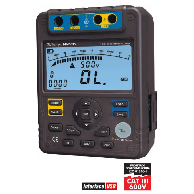 O megômetro MI-2705 é um equipamento adequado para testar a resistência de isolação de transformadores, motores elétricos, cabos, interruptores, aparelhos e outros tipos de equipamentos elétricos onde faz-se necessária a aplicação de uma tensão de até 5kV.