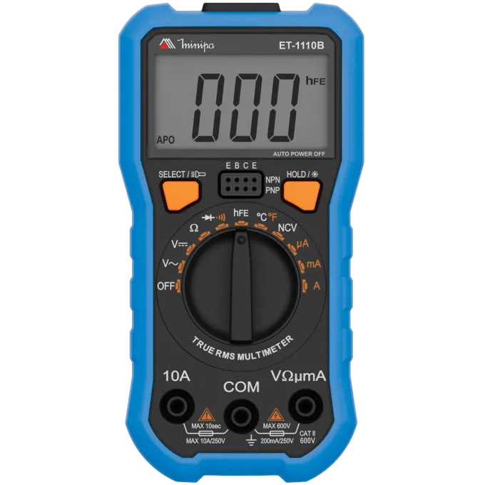 APLICAÇÕES: O modelo ET-1110B é um multímetro compacto, prático e de fácil manuseio. Ele faz medições de corrente AC/DC, tensões AC/DC, resistência, temperatura, teste de diodo, continuidade e hFE. Além das funções de desligamento automático, data HOLD e NCV.