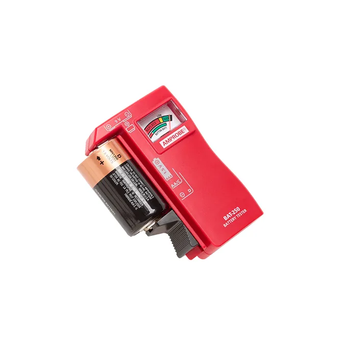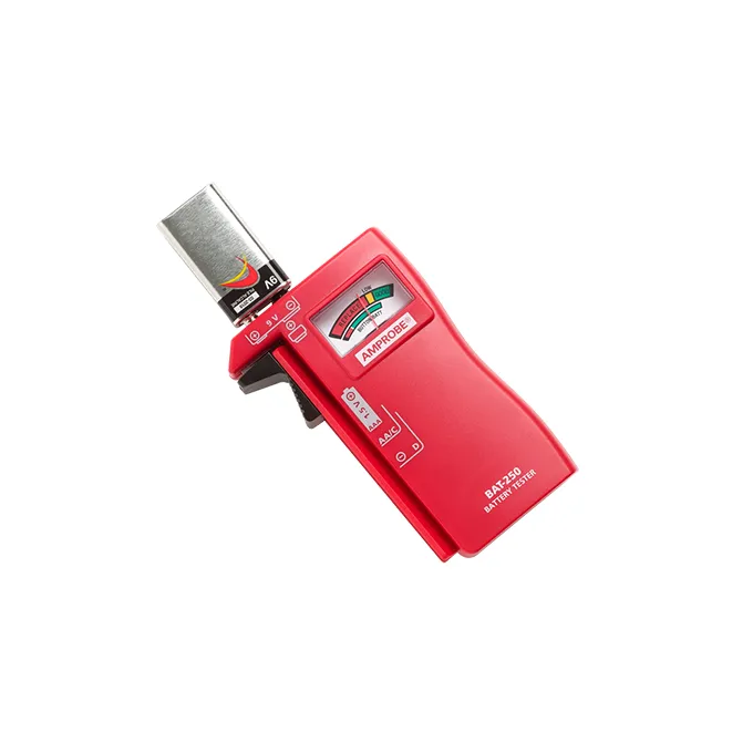 A falha da bateria é uma das causas mais comuns de falha do sensor ou do instrumento. O testador de bateria BAT-250 indica a quantidade de carga restante nas baterias padrão e recarregáveis. O ponteiro do display analógico se move em uma escala calibrada codificada por cores para identificar rapidamente o status da bateria “boa” (verde), “fraca” (amarelo) e “substituir / recarregar” (vermelho). O BAT-250 testa baterias do tipo botão de 9 V, AA, AAA, C, D e 1,5 V.